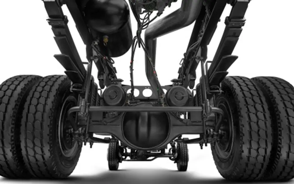Molas Parabólicas, amortecedores hidráulicos de dupla ação, com barra estabilizadora. Suspensão elevada